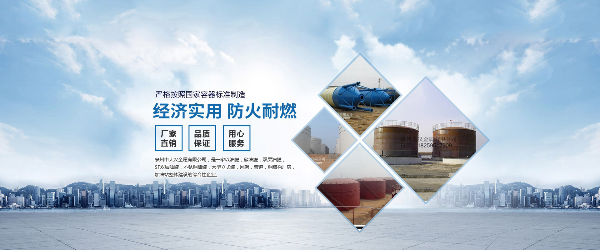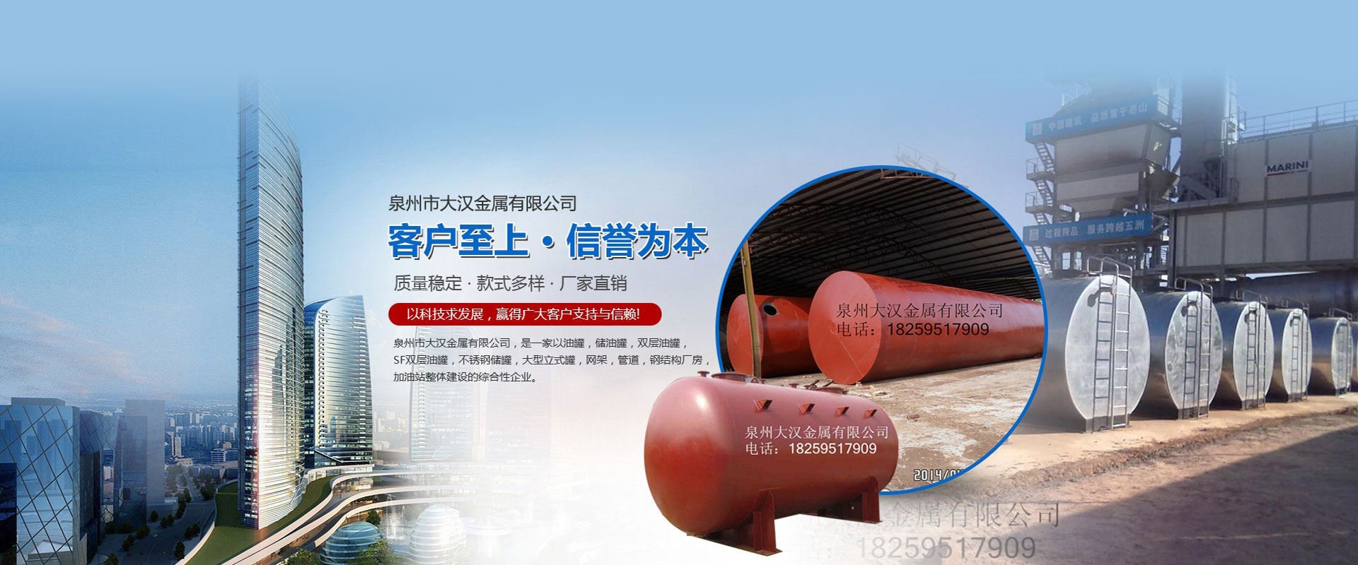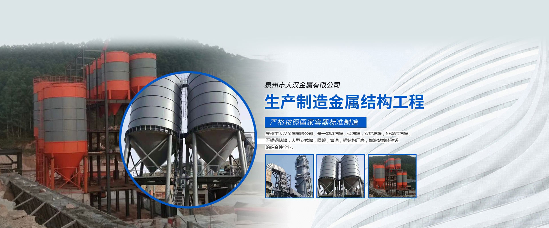 泉州市大漢金屬有限公司,是一家以油罐、儲油罐、雙層油罐、SF雙層油罐、不銹鋼儲罐、大型立式罐、網架、管道、鋼結構廠房、加油站整體建設的綜合性企業。本公司以技術人員、施工經驗豐富的工程隊、自動化設備、擁有鋼結構建筑、螺栓球網架設計安裝技術力量,嚴格按照國家容器標準制造,是一家產品開發(fā)并生產各種壓力容器和制造金屬結構工程,化工石油工程安裝的大型企業。近多年來,以質量穩(wěn)定、客戶至上、信譽為本,以科技求發(fā)展,贏得廣大客戶支持與信賴。